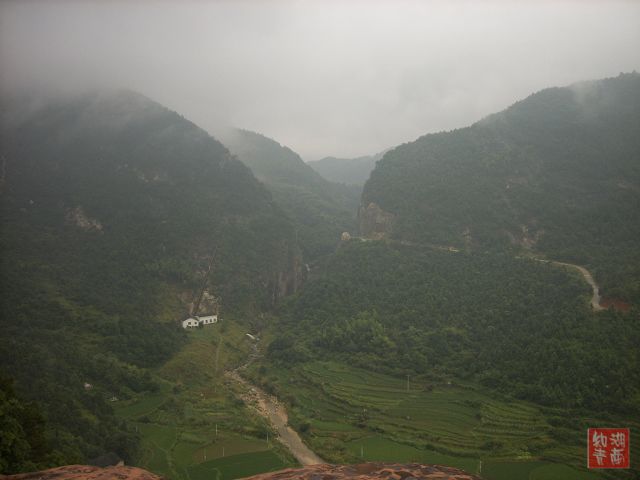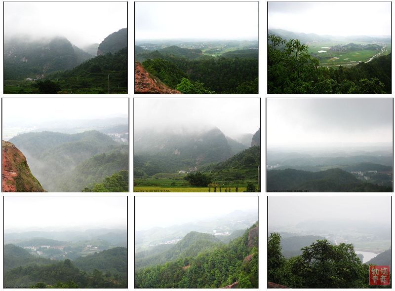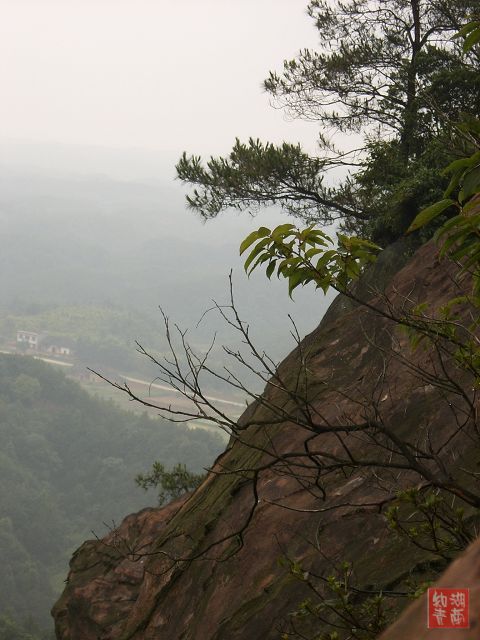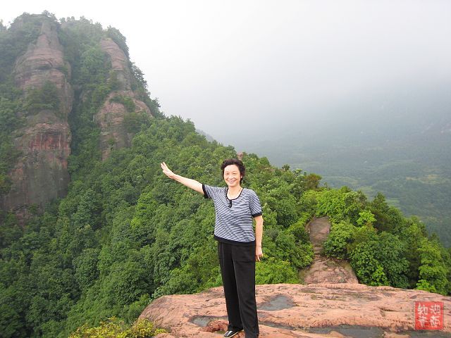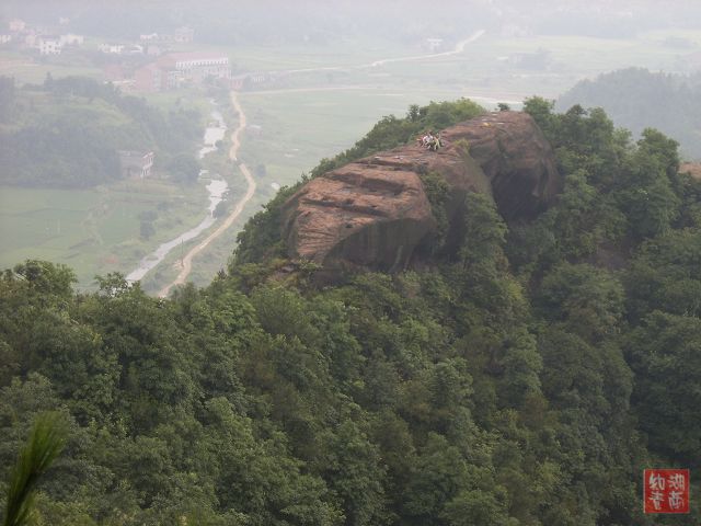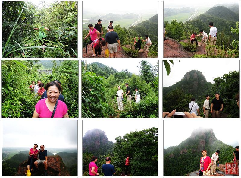 9) 要照的已换了多个角度多个姿态取景完了.时间快到中午12点,天已经放晴,被沾湿的衣服也快闷干,而这时,石牛寨的顶峰也露出了它那如华山般的峻峭和凝重,也如斗士般在等待着对手来过招.我曾去征服过它一次,感受到那攀越冒险的刺激,特别是那近乎垂直的40米峭壁,非一般胆量是难逾越的.我那时就说过,我要来三次以享征服它的快感.于是,我大声叫道:出发吧!到山顶去,有更刺激更壮美的好景啊.谁知,传来了几声显然带着恐惧的底气不足的声音:别去了吧,很危险的啊!