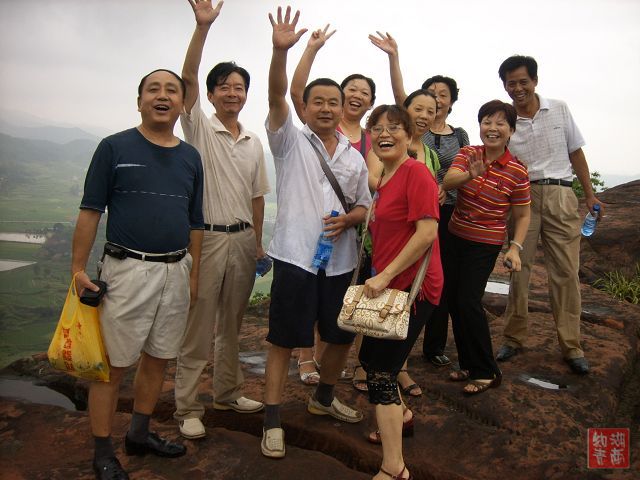 7) 要上第二阶梯,就开始折腾人了.这山还没怎么开发,凸的一块大巨石,高就达四五米,仅仅是人工粗粗的凿几个小石眼,一只脚都放不下.山里人有了这么个小支点,上下就全不在话下了,可苦了这些个曾战天斗地过的老娭姼们.熊靓西乡等老姐们只得哇哇叫的吆喝着事务长艾耙耙等来拉来推,一幅狼狈象换成了英雄救美图.岚晓好在有纱帽老公做帖身护卫,一路关爱有加,她俩也乐得听我们的啧啧赞声.赶集与东篱菊这时还算是女中豪杰,手脚并用的一下一下扑了上去.汗水泥水,点缀着时尚的装扮,如西乡熊靓竟还穿着高跟鞋,也还真是登山的一道风景呢.