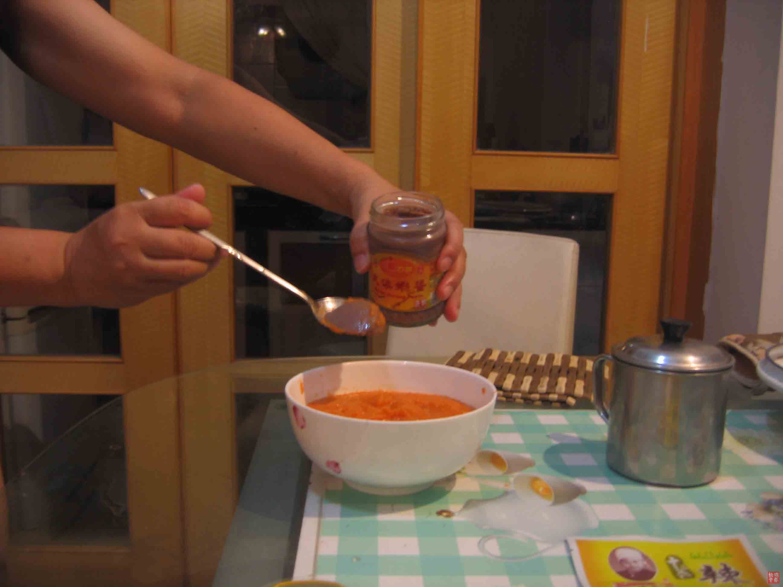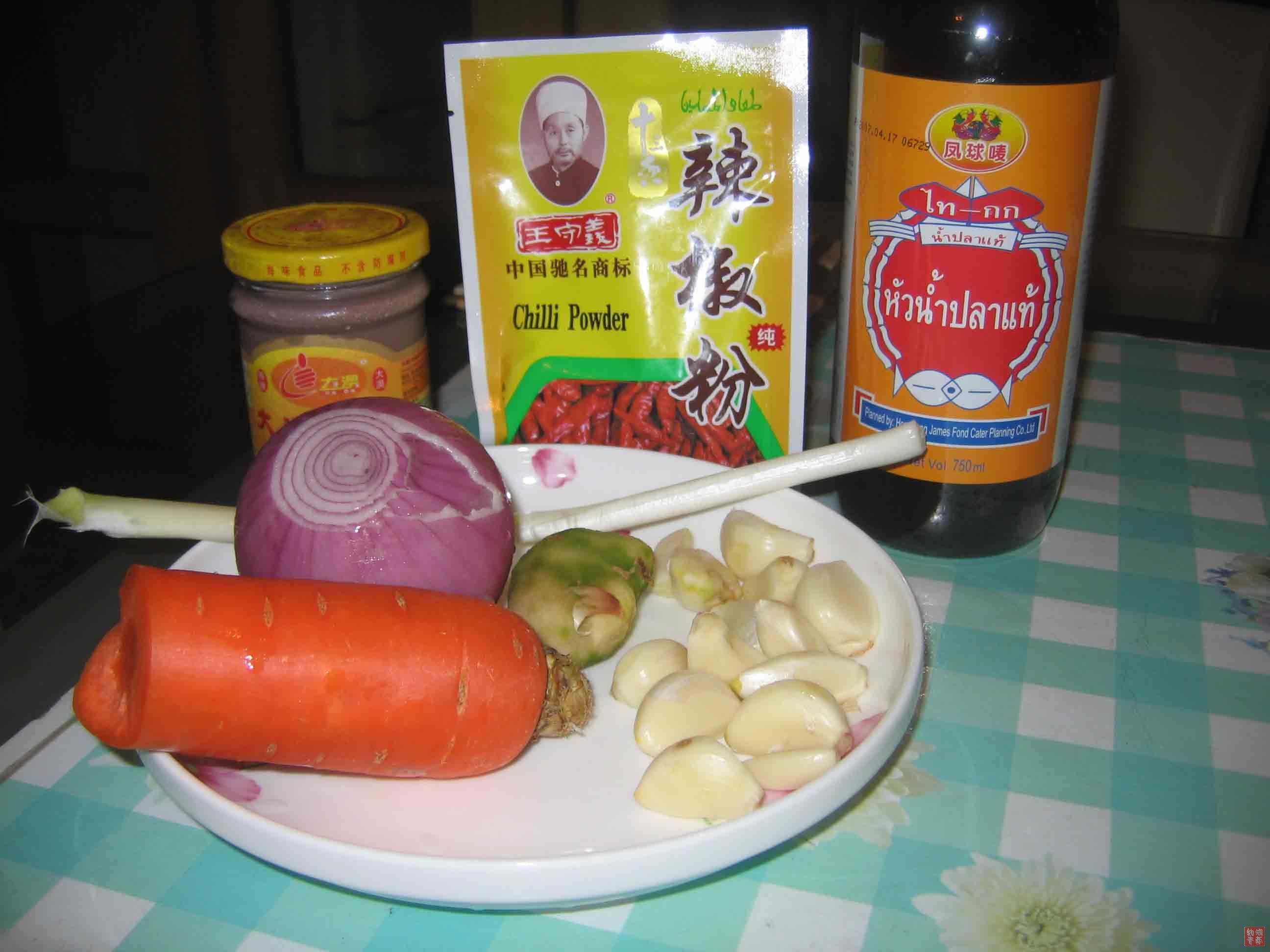 3。调料; 白糖1勺 鱼露5勺 澳门虾酱1勺 无籽辣椒粉30克