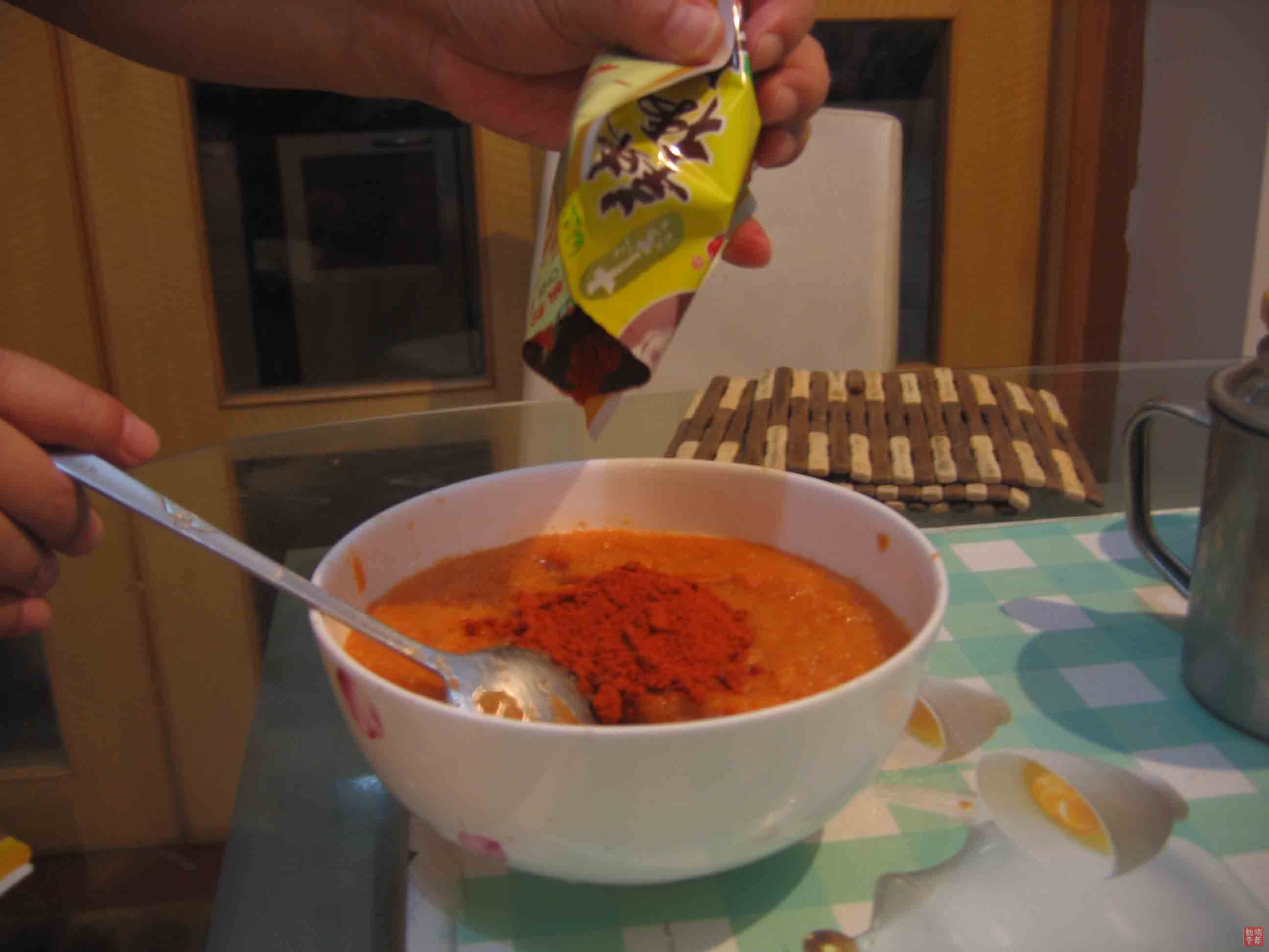 E 加入无籽辣椒粉30克 ,搅拌均匀成鲜红色的酱汁。