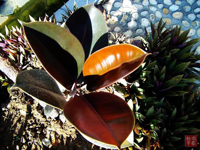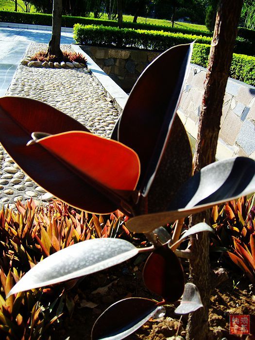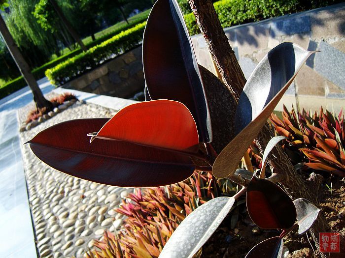 今早出门,只见这种植物的叶子在阳光映射下,美丽多彩,只是叫不出名字。管它是什么,拍下来再说。