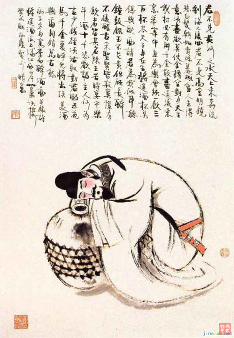 品味诗歌里飘出的酒香,那是多么惬意的一件事!一样的酒气淋漓,一样的真情四射,不是吗?一个个的古人从诗歌里走出来了:“酒酣曾唱大风辞”的刘邦,“把酒问青天”的苏东坡,“酒渴思吞海,诗欲狂上天”的杜甫,“天子呼来不上船,自称臣是酒中仙”的李白,总爱吟唱“人生得意须尽欢,莫使金樽空对月”,似醉非醉似醒非醒似仙非仙似圣非圣大袖飘飘而来..与这么多的古圣先贤相聚,我早已酒不醉人人自醉了!