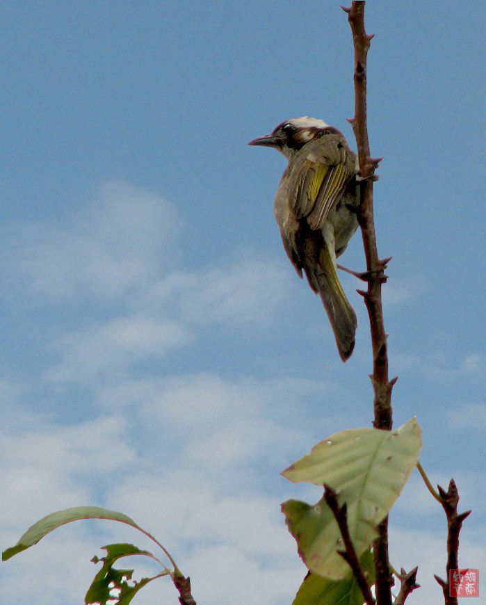 在湘江风光带散步,拍得树上的一只白头翁。