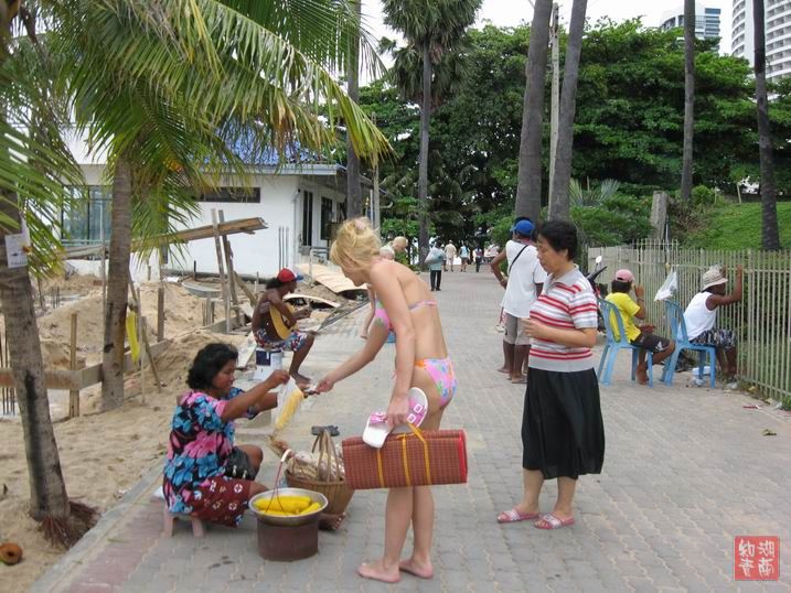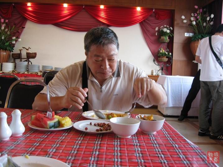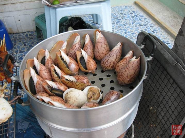 泰国华人多,而我们所住的宾馆,又都是华人宾馆,故饮食与国内区别不大。但泰国又靠海,其一些特有的海产品又是我们这些生活在内地城市、且很少吃海鲜的人所感到稀奇的。下面的照片,前面是宾馆早晨的自助餐的食物,后面是泰国著名的旅游圣地巴堤雅海滩上的海鲜,极新鲜。