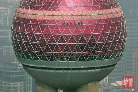 “蜘蛛人”悬挂在东方明珠球体上显得那么渺小。