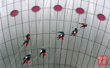 坐在球体内用餐的游客和窗外清洗的蜘蛛人。