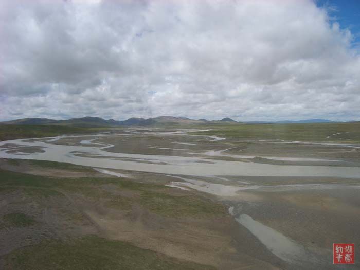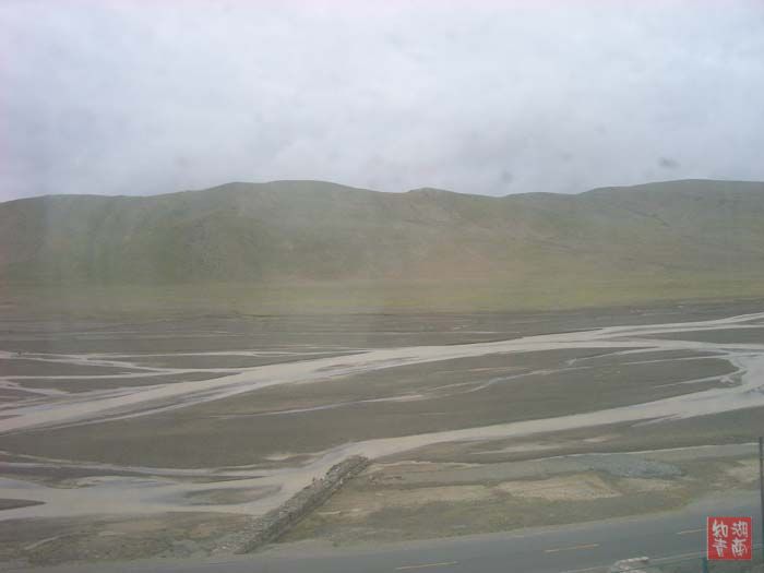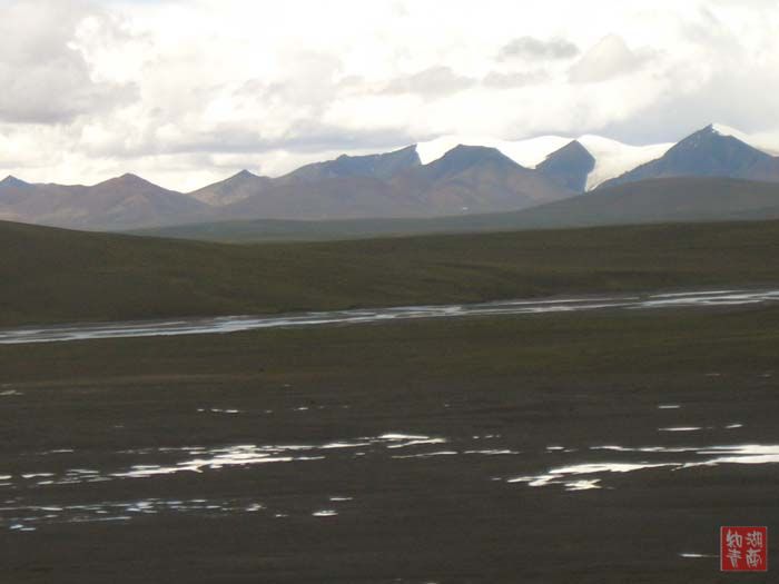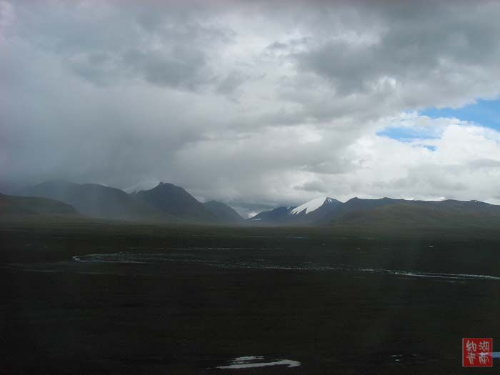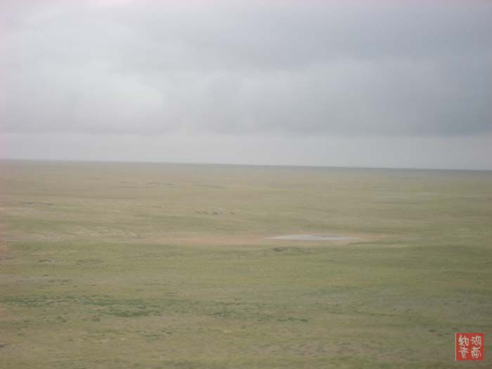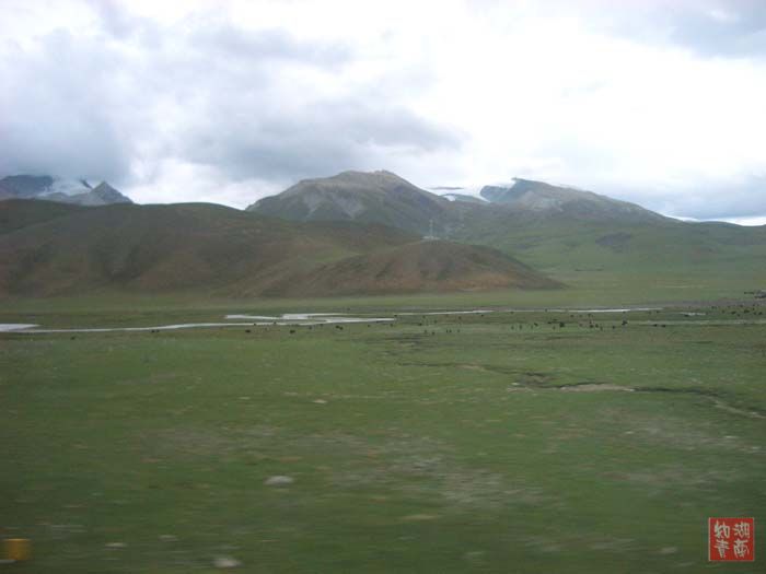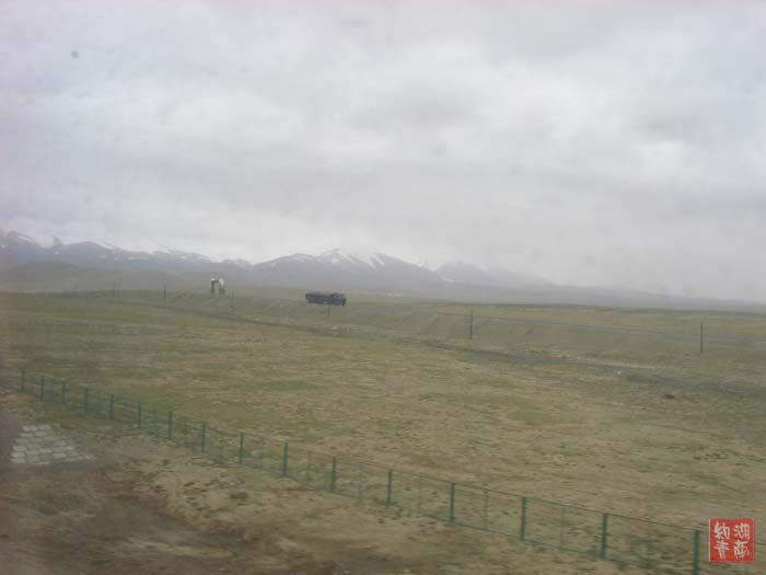 过了海拔5072米的昆仑山口,我们进入了可可西里。与昆仑山北面的原野一样,可可西里的原野也一望无际。当然远处,也是浓云遮盖着的神秘的雪山。与昆仑山北面的原野比较起来。可可西里的原野显得有生气多了,草鞋也绿些,原野上的水洼也多些。显然是由于没有昆仑山的阻挡,昆仑山南面的水气要比山北的水气更丰富。在可可西里的草原上有藏羚羊,不过火车飞奔,想看到并不容易。但是郴英看到了几次藏羚羊和野驴,并拍到了它们。我的眼睛不好,眼镜又坏了,所以一次也没有见到。