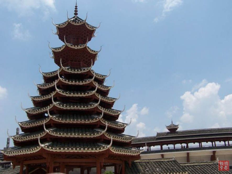 在描述一个典型的侗族村寨的建筑时,有一些最基本的构件是不能忽略的:鼓楼、萨堂(祖母祠)、戏台、民居、禾晾、禾仓、寨门、凉亭、风雨桥,鼓楼前的歌坪。这十大件实际上已构成了一个完整的侗族村寨聚落于社区中的一个建筑群,其中最重要的当然是鼓楼、民居、萨堂、风雨桥了。