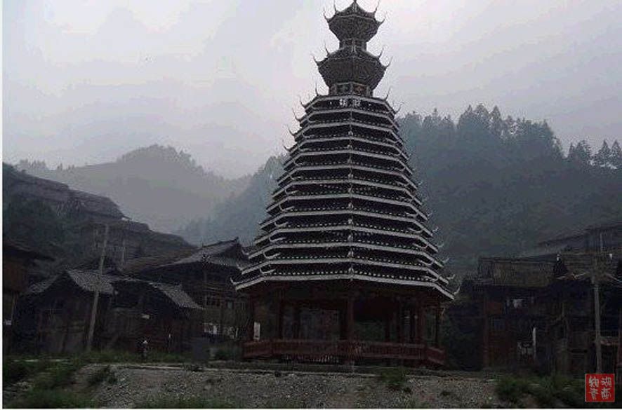 侗寨的建筑群是以鼓楼为中心而展开的一个文化场域,它是侗乡特有的文化风景并且是真正诉之于视觉意义上的文化风景。鼓楼是一个寨子的中心,鼓楼附近是歌坪、戏台、萨堂,这四部分构成了侗寨的核心圈。紧紧地周绕着鼓楼的是民居住房圈,再外一圈是禾晾和禾仓,接着是寨门、凉亭、风雨桥。