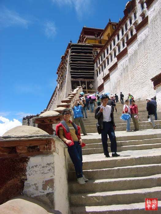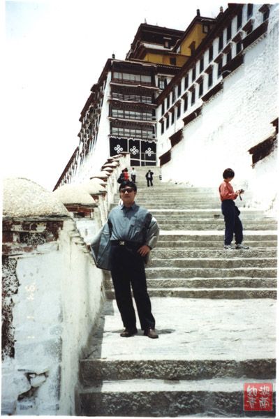 我们首先凭着一张进宫的通行证从侧门进入到布达拉宫的大院内,然后在高大雄伟的布达拉宫下的一幢小屋里进入第二道门,并接受了安全检查。经过第二道门后,我们开始沿着布达拉宫宫墙下长长的坡道向上攀登。这里仍可以拍照。我们当然不会放过这样的好机会。一路上我们拍了不少仰视布达拉宫的近景照片和布达拉宫下面拉萨市的广场、街道的照片。走完斜坡,我们进入第三道门, 在这里集体购了票(每票100元)。