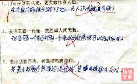 天命兄从哪里弄来的这些卷子,看来是原始作品呢。你看那老师打叉时的哪个果断劲,都连起来了,有点像一个钩上打点了。