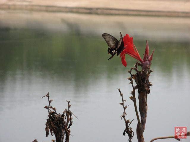 正如老师所说,事前我肯本没想那么多,大脑一片空白,不知要拍什么。突见水库边两只蝴蝶围绕着美人蕉在飞舞,我和曼姐惊喜若狂,马上举机追拍,可怎么也追不上飞舞不停的双碟,它们一会飞远,一会又飞回,反反复复,最后一只不留。我们失望地回玻璃屋,走两步不甘心,一回头见又飞回一只,这回毫不犹豫立马对准花儿一按快门,谁知歪打正着(直到下午打开翻看,才知逮着了一只)。