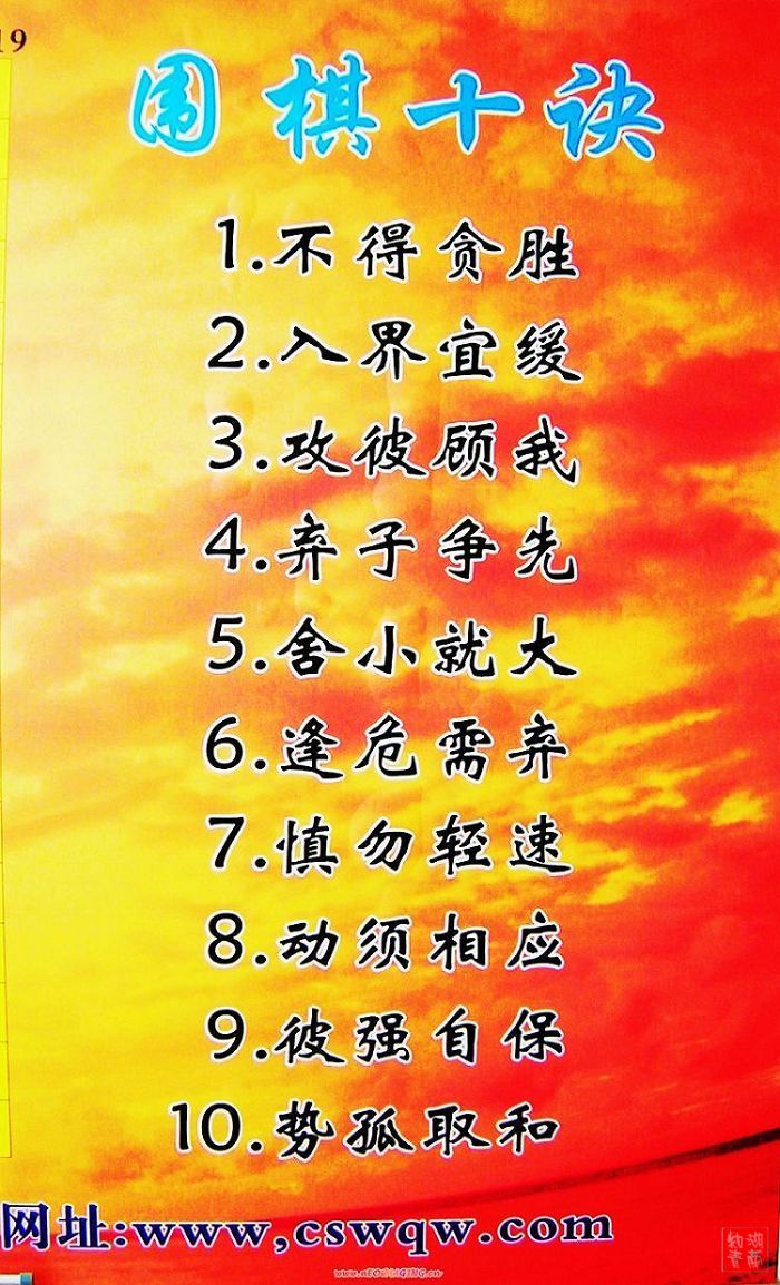 我观围棋如人生,人生亦如围棋。青少年时代正像围棋的布局阶段。布局的好坏关系到棋势的优劣,善弈者必懂得合理布局,聪明人也都知道在青少年时期要打好事业的基础;围棋的中盘进入激烈的争夺,双方使出浑身的解数抢占地盘,这是决定胜负的关键阶段,人到中年家庭事业的重担最为沉重,同样需要争分夺秒,全力以赴,是出成绩的黄金时期;晚年则相当于围棋的官子阶段,此时虽大局已定,但也不能等闲视之,失去已有的战果,做人则可能功亏一篑,晚节不保。