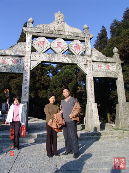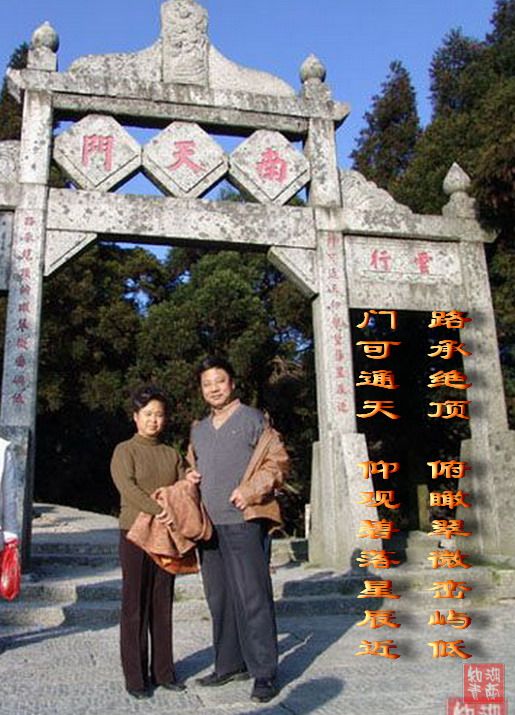 看得出来,老灯火夫妻恩爱有佳,夫妻同游南岳是件美事,南天门是连接主峰的纽带,南天门距南岳镇十八华里,经半山亭,过邺侯书院不远,就到了云笼雾罩的南天门。南天门的石牌坊分中门和左、右川门,中门上方横额镌有“南天门”三个描红大字,左、右横楣上刻有“行云”、“施雨”,对联是:“门可通天,仰观碧落星辰近; 路承绝顶,俯瞰翠微峦屿低。”字迹端正醒目。