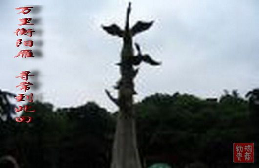 回雁峰——南岳第一峰,相传北雁南来,从秋到春,不再向南飞过这座山峰,在这暖和适宜的地方度过寒冷的冬季,待春汛到衡阳,仍然往北飞回。所以叫回雁峰。北宋王安石诗云:“万里衡阳雁,寻常到此回。”从此,名声远播,愈为人晓。走进景区雁峰广场,引人注目的就是这座大雁雕塑,雁高12米,4只铜铝合金铸成的大雁形态各异,昂首云天,像是在欢迎远方游子的归来,现在这座雕像已成为衡阳市的标志《雁城》。