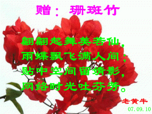 谢谢!谢谢老黄牛这样厚重的馈赠,你对珊妹的赞美,使珊妹脸红心跳都不好意思了.珊妹没有你说的这么好,倒是非常羡慕文武双全老黄牛.有思想,有人品,有才华,让我望尘莫及.再次谢谢你----令人敬佩的老黄牛.