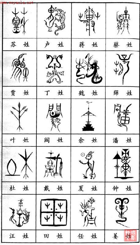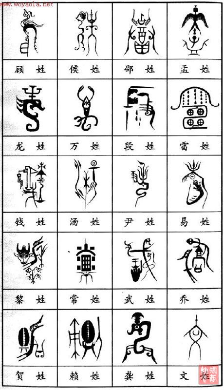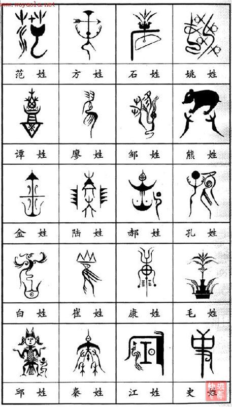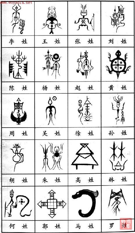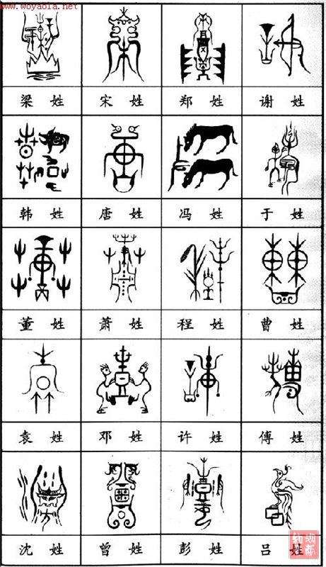 这是古老的甲骨像形姓氏图腾文字,每个图腾是一个姓氏部落的标志。
