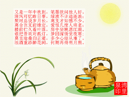 中秋怀旧 湾里泉/图文 又是一年中秋到,笔墨欲问故人好。 清风可忆昨日事,绿波不计追逐浪; 聚时总说岁月长,离支才知憾不少。 离合岂无前缘定,爱恨几度人将老; 楼前伫久看叶落,房中坐晚思江潮。 谁把昔欢对孤灯,梦回深情觉夜寒; 莫言沧桑归正道,多少心结从难了。 浊酒重添醉花间,何期再得明月照。 |