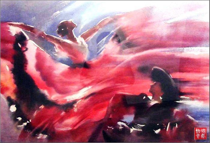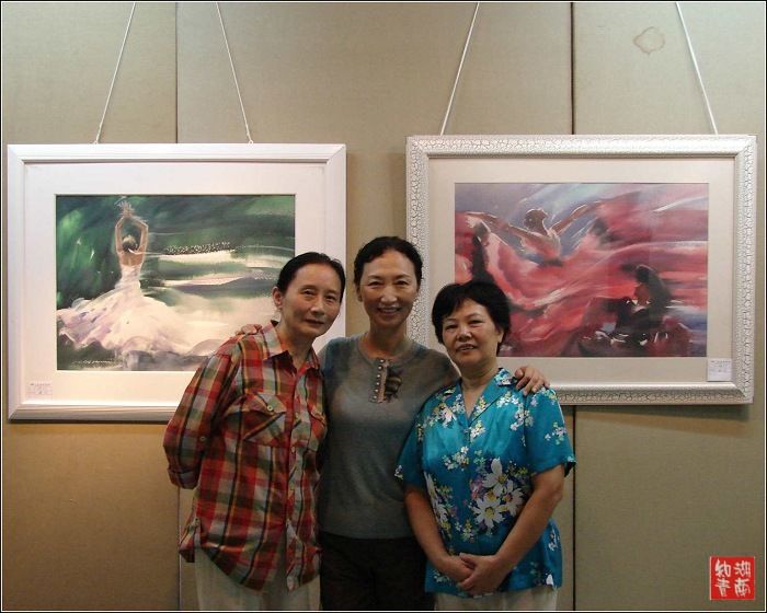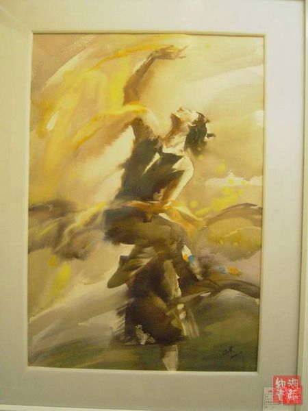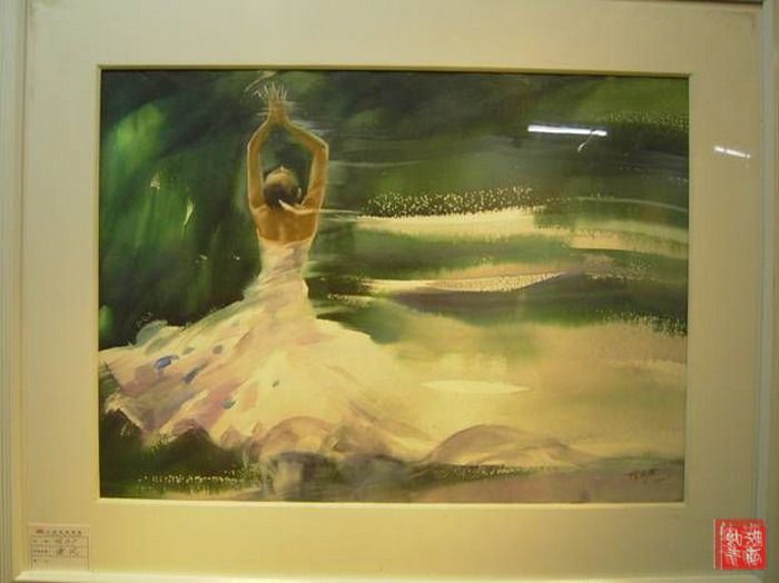 10月4日.我和飞山相约去“三亩地画展”看乃广参展的的画,有幸碰上了几位才女:落霞、潇湘子、良石、和罗丹等。 他参展的画有四幅,每一幅都是舞者,是栩栩如生的舞者。.乃广的画中,体现了他深厚的艺术根底,这是他长期不懈努力的结果。他不仅长期习画,他在舞台上多年的歌舞生涯也让他积累了不少的经验,他的成功是由于努力精进,是来源于生活,是艺术的积淀。 在他的画中的舞者的原型,我感到就是他的亲密伴侣——潇雨,每一幅画中都有潇雨的身影,他们是多么幸福的一对。祝愿水彩画精英能在事业上取到更大的成就,祝愿潇雨、乃广幸福永远!
