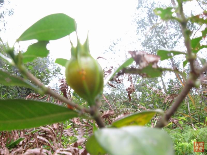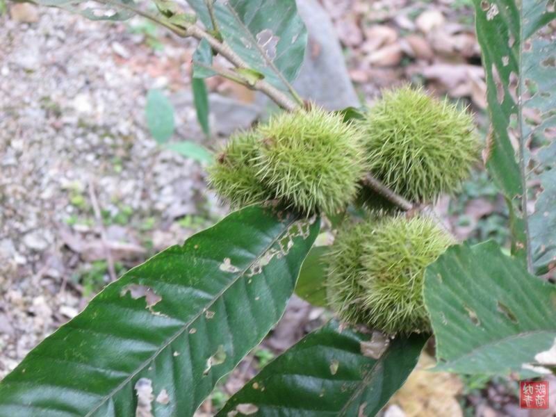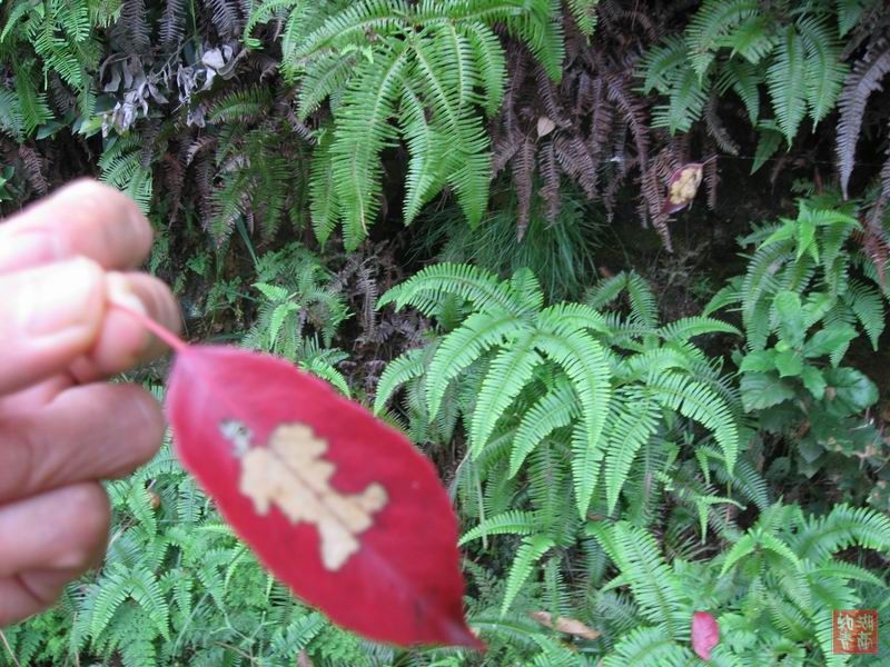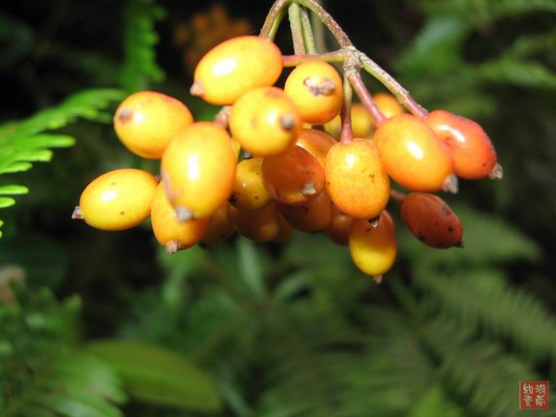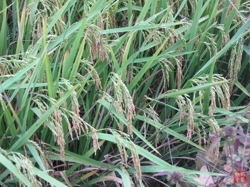 不知名的野果;黄栀子,就是栀子花的果实;一片中间有着奇特花纹的红叶;稻子,还要十来天才能收割。