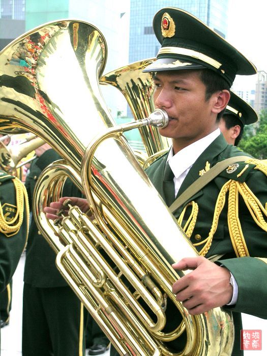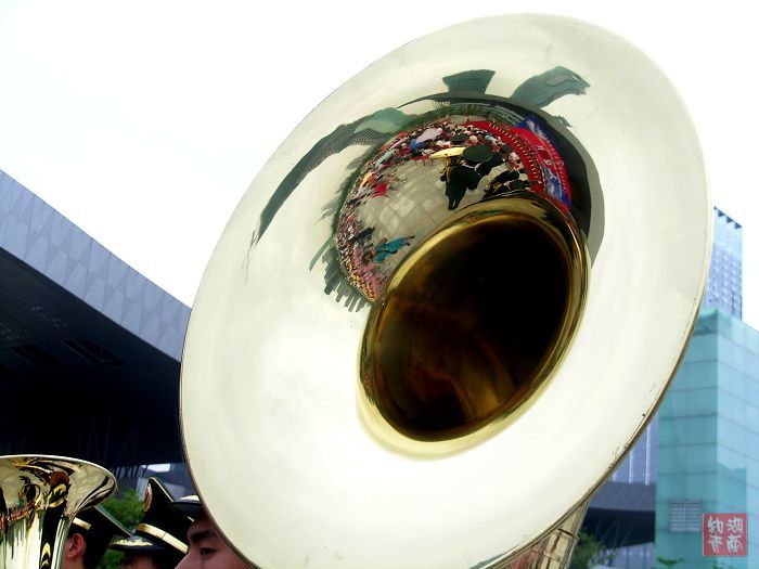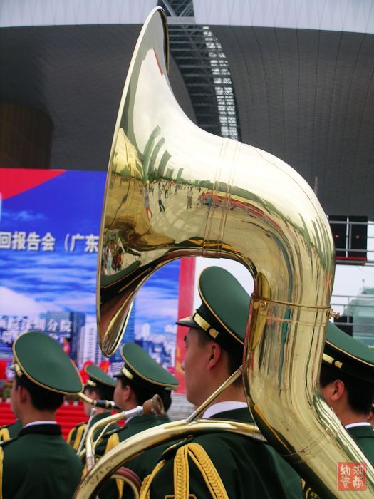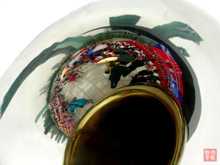 我从来没有这么近地看过军乐队,那天旁观开幕式。开始我还不赶太靠前。后来见对我们自发来的人没有过多地限制,便得寸进尺大着胆子近距离地拍下了那两张大喇叭口的照片。