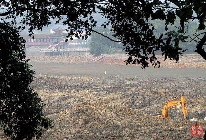 镜头推近一些,可见到风雨桥。挖掘机挖得够深的了,可能就是这个位置,清淤泥应该不要挖这么深吧。