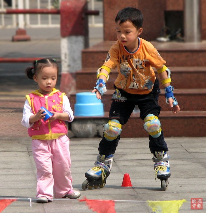 几个细伢子正滑得起劲,突然跑进来一个细妹子,捡起细伢子们放在地上做标记的小杯子就走,急得一个细伢子直追哒喊: