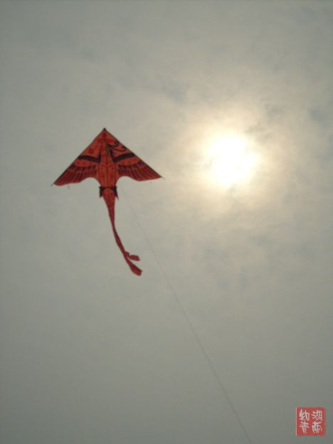 老人说电视上有一人把风筝对着太阳放,照出来的像是太阳里有个飞机,但他又说今天风太大风筝稳不住,两边窜来窜去,我拿相机只好守着一个位置,等风筝刚窜回来就按快门,结果还是差了一点,蛮有味,怪不得老人是戴着墨镜放风筝。