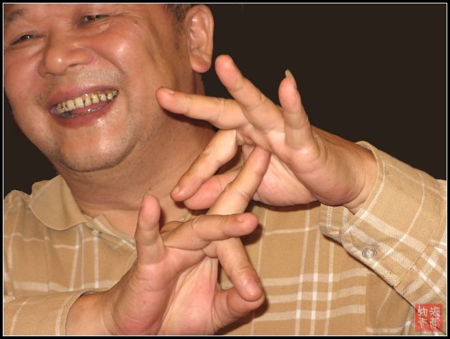 你们看这个男子汉啰,翘起咯兰花手还蛮妩媚呀!只怕是梅兰芳的第子,下次碰哒非得叫他依依呀呀来一段不可。