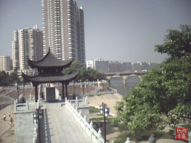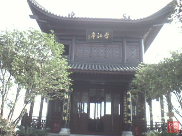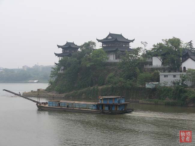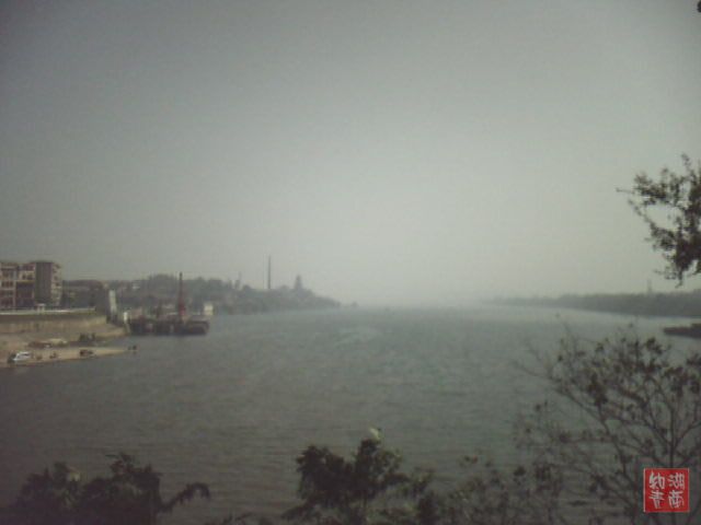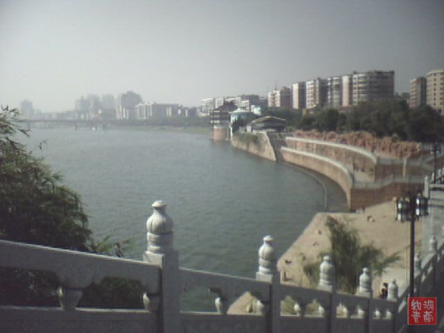 我们叹息着,来到了“合江亭”,这个亭始建于唐贞观时(公元645年)。登上亭楼,放眼四顾,左蒸右湘,江水如练,粼光闪烁,虽无在腾王阁看赣江的那般令人激奋壮怀,却倍感心旷神怡,一扫尘世嚣华,被朱陵洞薰得喘不过气的心境立时神清气爽。凭栏远眺,江天相接,浑然一体,左岸远处还可见衡阳的另一胜景——来雁塔(该塔距市中心三公里,与市南端的回雁峰遥遥相对,已有四百余年的历史)。我们在此指点江山,纵论古今,久久不舍离去,好不惬意!