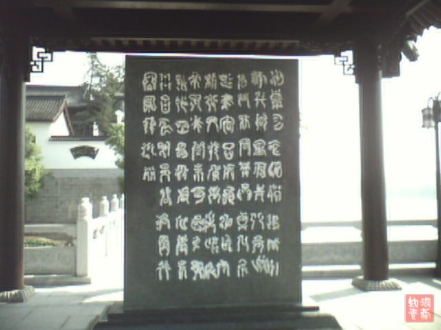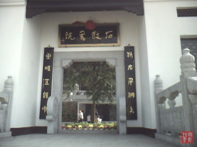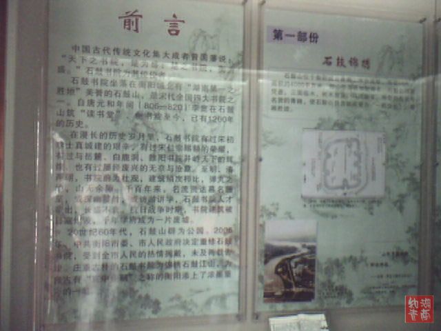 在石鼓前照了相后,眼光一扫,就见前面的崖壁上嵌有花岗岩的巨型石书,走近一看,原来是朱熹作的《石鼓书院题记》镌刻在上。书院其实早已是名存实无,它毁于1944年日本鬼子的狂轰滥炸,现在的几间仿古书房,只不过聊以寄托人们的緬怀之情而已。