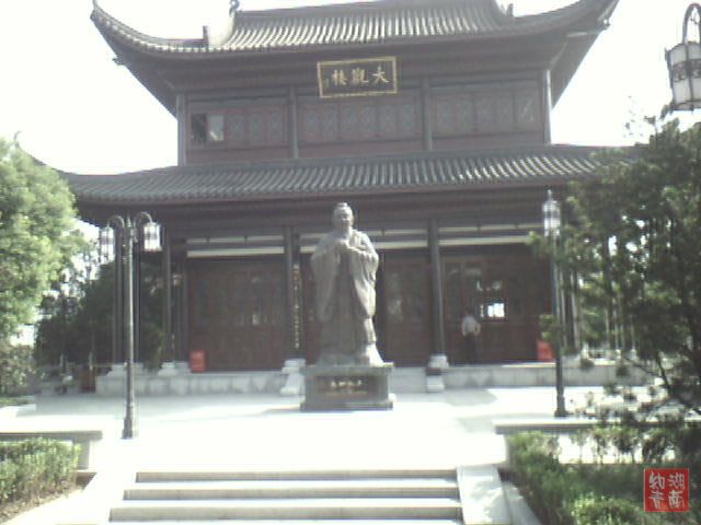 再登十几级石阶,在大观楼前看到一座高约四米的石像,原来是孔子(这座石像也是新建的)!这位伟大的人民教育家和思想家,其理论影响了中华民族两千多年。但仁者见仁智者见智,他的理论常被曲解,失掉了他的本意,从而造就了我们民族性格中软弱的一面。试举两例如下: