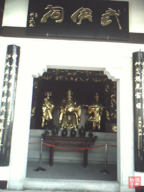 又登了十几级石阶,来到“武候祠”,我的记忆中原先是没有此祠的,是这次重建时新添加的。祠中的孔明像,羽扇纶巾,气定神闲,儒雅俊逸。据说当时诸葛亮以军师身份来到衡阳督办三郡的军务,并住在石鼓山上,衡阳人民为纪念诸葛先生“鞠躬尽瘁,死而后已”的精神,在石鼓山的左边建了“武侯祠”,以供祀享,如今原祠已无迹可寻。对于诸葛先生,我最佩服他的就是用兵如神,“谈笑间强虏灰飞烟灭”,了不起啊!