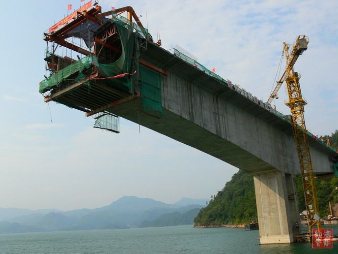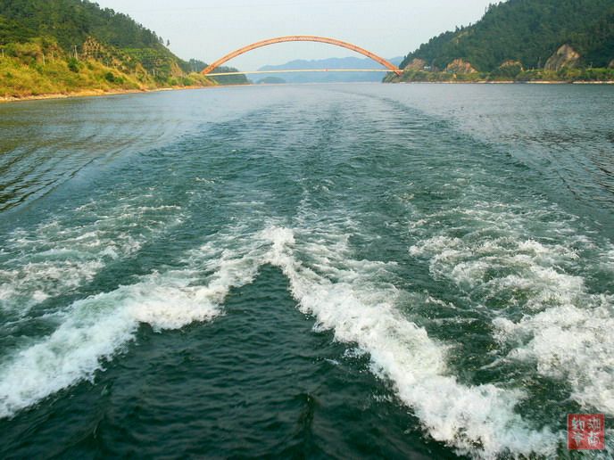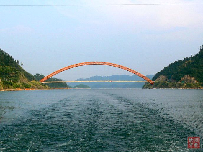 对,这是在千岛湖去安徽的水路,新安江上正在新建的大桥,当我们的船从桥下经过时,桥上的工人在向我们打招呼,我们也给予回应!