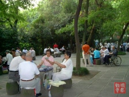 清晨6时,麻友们就占好了石桌石椅,打上海的纸麻将。