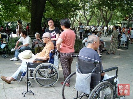 中风偏瘫的老人也要座轮椅到公园耒赏心,表现了顽强的生命力。