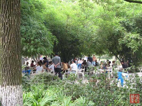 我们从岳屏山南面下山,再绕行到东面。这里有由大湾塘疏凿成的人工湖——云水湖,就象嵌在绿丛中的一面玉镜。湖岸边有八角亭台,亭台上有吊脚茶楼,楼柱上有楹联: