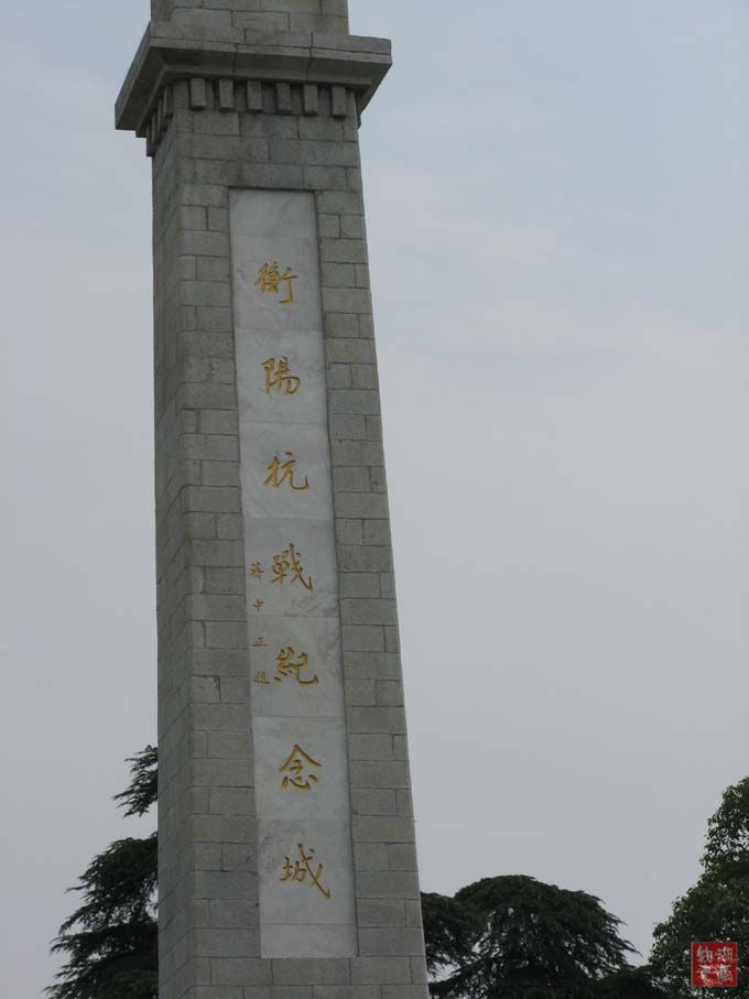 抗战期间,国民党第十军在衡阳英勇抵抗十倍于己的进犯日军,历时47天,衡阳成了抗战的英雄城市。民国36年(1947年) 8月10日,衡阳各界在岳屏山顶举行“衡阳抗战纪念城”立碑奠基典礼。塔为六边形,高17米,塔前有二座辅亭,塔的正面刻着蒋委员长的手书题词“衡阳抗战纪念城”。解放后,此塔改称“衡阳解放纪念塔”(我小时来玩时看见的就是这七个字),为尊重历史,于1987年仍恢复旧名。2007年,市政府再次进行维修,将塔身加高,重新刻上蒋委员长的题词(此塔现在是省级重点文物),辅亭“纪功亭”也修饰一新,恢复了“衡阳抗战纪念堂”,新铸了“和平钟”,供人们凭吊衡阳抗战阵亡将士。我瞻望着纪念塔,心潮澎湃,历史终于回复了它的本来面目,不论共军国军,凡在抗战中牺牲的烈士,他们都应永垂不朽。