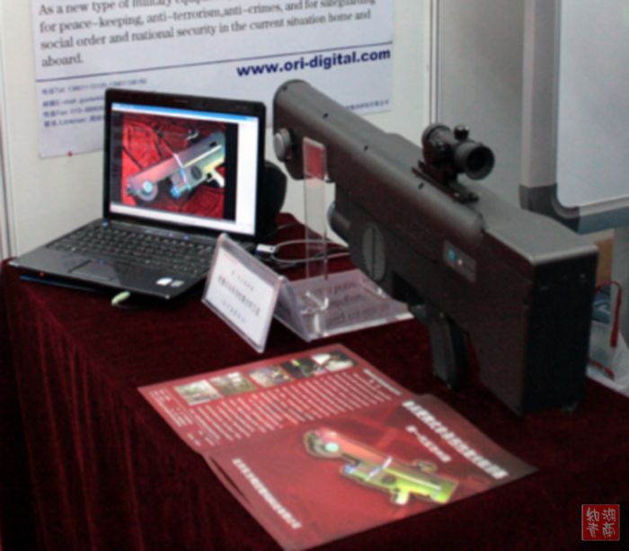 这是北京一家公司研发的单兵便携式非杀伤性激光眩目器。此器使用时可短暂使人失明,展出者说,这可以用于反恐。因为可使对手短暂失去战斗力,并会动摇其意志。