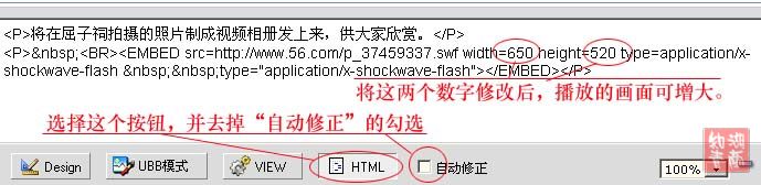 下一步可对播放的代码进行修改,使播放的画面加大。点击具有播放界面的一楼帖子下面的“编辑”,再按下图中的提示进行修改,再播放时界面就大多哒,图中数字我已修改了,原宽为430,我改为650,原高为370,我改为520了。