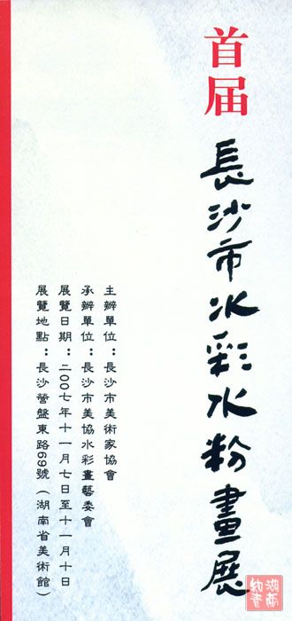 由长沙市美术家协会主办、长沙市美协水彩画艺委会承办的首届长沙市水彩水粉画展将于二零零七年十一月七日至十一月十日在湖南省美术馆(营盘东路69号)举行。