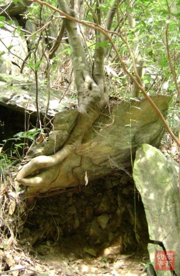 山茶树长在路边一片不起眼的树丛里,它起先也是弯曲盘卷着紧贴着石头生长,现在却傲然挺立在石头上,躯杆笔直,枝叶繁茂!据说在这种贫脊土地上生长的树,看起来不大,可是树龄却很长.就像张家界石峰上的松树,看起来盆景似的,但大都有四,五百年的树龄.这棵山茶树也许经过了上百年的努力才能如此枝躯杆茁壮枝叶招展地挺立在阳光中.