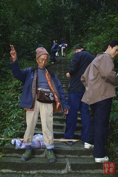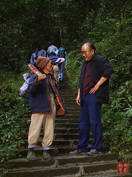 在张家界森林公园景区的一条山路上,我们正吃力的朝山上走,迎面遇到了一位下山的老汉,个子单瘦,年纪较大,脚步却非常稳健,看他的穿着和手里拿的竹扁担,就知道了他的身份——挑山工。估计他是刚送完一趟行包下来的,头上还冒着汗。我们停住了脚步,问老汉:多大年纪了?挑得动不?老汉耳明,爽朗的回答:78岁了,干了好多年了,还给外国人挑过包包!我们同去的一位先生给了他一点零钱,他竟唱起山歌回送我们,还对我们频频招手,以示友好。看着老汉的神态,我们感叹:张家界秀美的大山磨练了老汉一幅开朗而勤劳的性格哟!78岁的山里老人如此辛劳真不容易。回来后再仔细看照片,原来老汉就是乡音姐在<<挑山工>>一文中描述的张家界那位挑山老人。