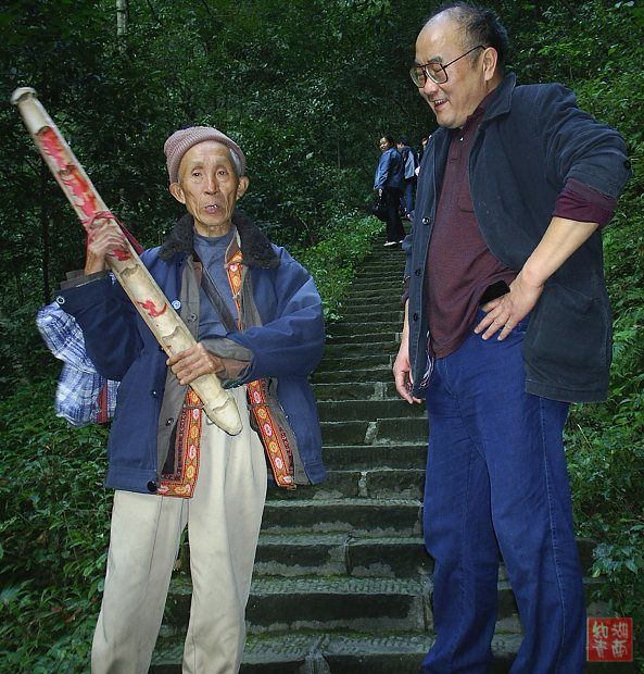 大门外过来一个瘦小的老汉,他放下长长的扁担,同时也放下了搁在扁担两头的四个沉重的行李包。看他脸不变色气不喘的,自个儿拉过一条木靠椅,坐在马路边悠闲地望着马路上来往的人们。我习惯地拿起了桌子上的相机,想拍下这个挑山的老人,他却在那边说话了:“不要拍不要拍,我和好多人都有过合影了。”钰儿狡猾地朝我一眨眼睛,顺手拿过了相机,朝老人走去。也不知她和他嘀咕些什么,老人竟然高兴地唱起来了,唱了一首又一首山歌,他说是他们土家人的歌,最后竟然完整地唱完了《桂花开放幸福来》!看看老人来了情绪,我和钰儿开始得寸进尺,要求和他合影,于是他来者不拒,和我们合影并向我们说了他的祝福! 他今年七十八岁了,我问他还准备挑几年,他高兴地举起手来说 再挑十年没问题!