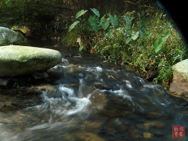每条瀑布下面都有一个深潭,有名的有月亮潭,水波清凉亮丽,宛如碧玉.但是太极潭上就没有瀑布.在它的上端有一条小溪,溪水汨汨地灌进水潭却没有激起太极潭一丝一毫的水波.它就像是一块凝固的玉石,名贵的墨玉,晶荧光亮.你想站上去,但终于不敢尝试.匍伏下去,掬起一捧水,水清亮透澈,仰头饮下,甘甜清凉.原来它水黒如墨并非水质不好,而是潭水深不可测!