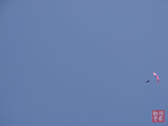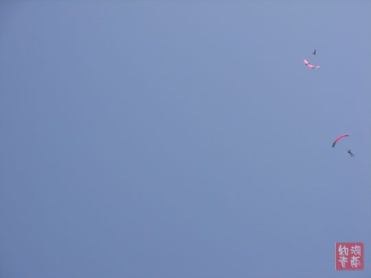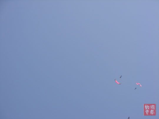 因阴雨中断2天的中韩军事跳伞对抗赛昨上午又恢复了,晴朗的天气下朵朵伞花绽开,衡阳飞机坪又如赶场一般热闹。