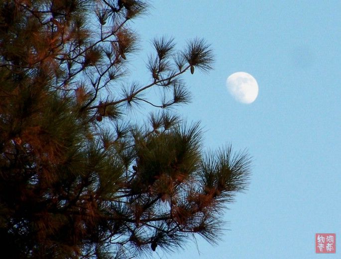 今晚月亮出得早,太阳还没落山它就早爬上了松枝头。
