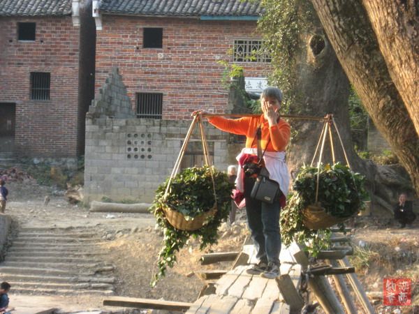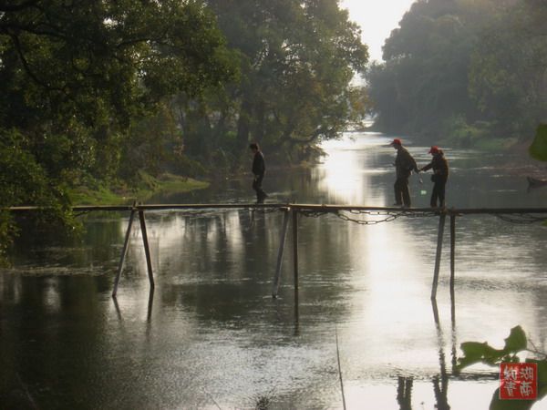 出村的小木桥,桥面只三块木板宽,厚哥牵着桢桢过桥