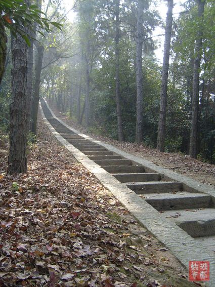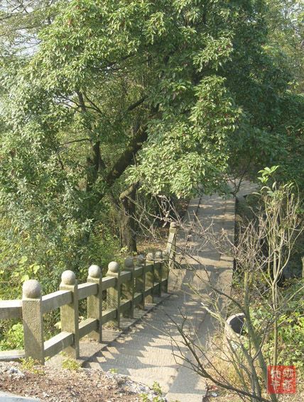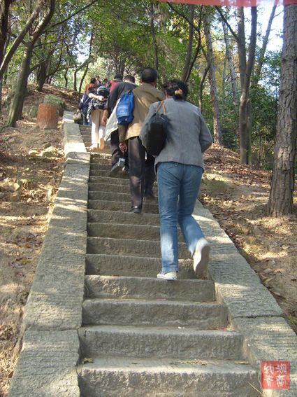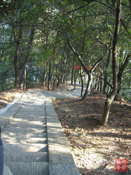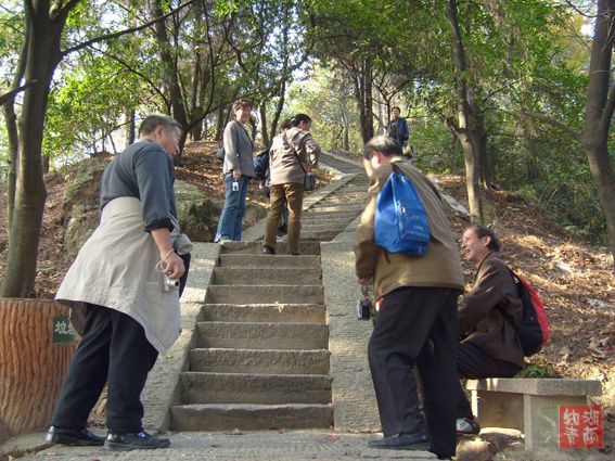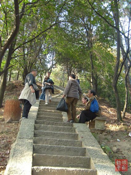 在停车场附近一农家吃了中饭,农家指示给我们另一条登山之路,待我们走到登山处,看到古蹬道的介绍,才知道,这边才是登山的正规的麻石古道,我们所走过的,是北道。南道有七百多级,抬头一望,几乎是直上直下,陡峭已极,如果把北道比作一位儒雅风流的真君子,那么,南道就是一位勇猛刚健的伟丈夫。我私下里倒觉得,这南道毫无特色可言,不如北道远甚,而山上所立的导游图上,有的竟然没有北道的标志,真不知他们怎么想的。我们气喘吁吁地爬上南道,中途还休息了几次,然后仍旧走昭山后门下山了。