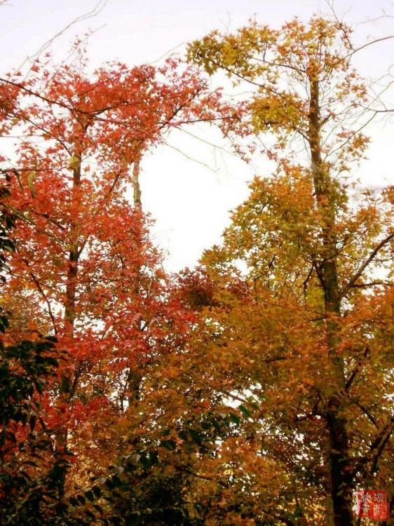 这对枫树长在我每天爬山都要经过的一条小路旁,每当经过我都要抬头望一望,好象对它情有独中.后来枫叶开始红了的时候,呀!我发现这对枫树好似一对热恋中的情侣,闻到了它们甜蜜如火的爱情气味;好似一对幸福恩爱的夫妻,心心相印.惊于这造化的奇妙,觉得是天赐我也,赶忙拍了下来.越看越心有所触,植物尚且日久生情,何况人呢?